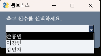[sg.Combo(key='combo' ,values=["손흥민", "이강인", "김민재"], size=(30, 50))],