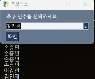 이 예제는 콤보박스를 사용하여 이름을 선택하는 윈도우를 생성합니다. "선수를 선택하세요."라는 텍스트와 콤보박스, 그리고 "확인" 버튼으로 구성되어 있습니다. "확인" 버튼을 누르면 선택된 선수 이름이 출력됩니다.