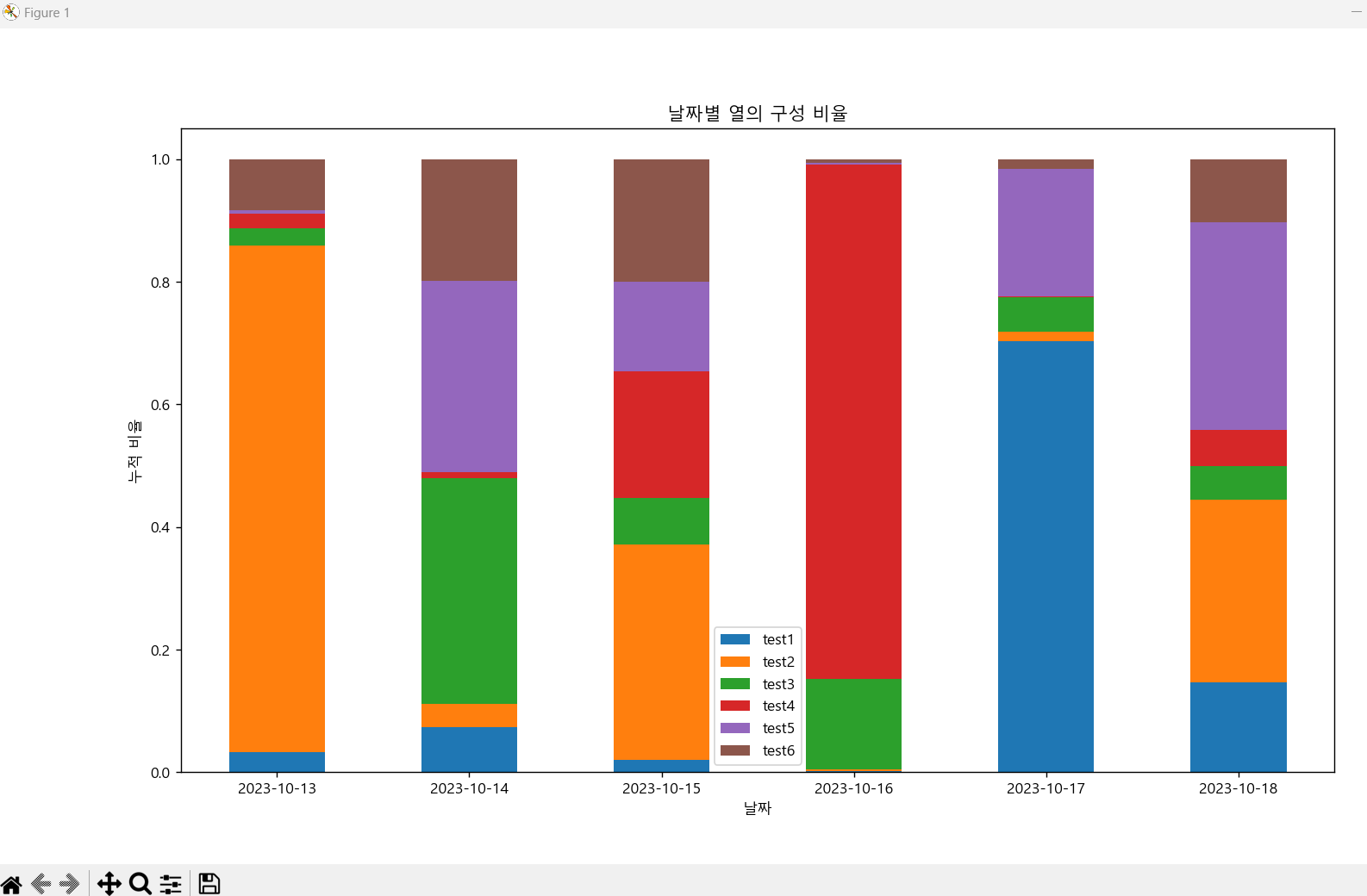 날짜별 열의 구성 비율을 나타냅니다. 예를 들어, 2023년 10월 13일에는 test1 열이 전체 데이터의 27.4%를 차지하고, test2 열이 12.6%를 차지합니다.