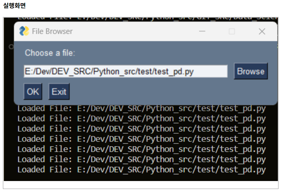 - 이벤트 루프: 사용자의 입력을 처리하는 이벤트 루프입니다. 사용자가 파일을 선택하고 'Open'을 클릭하면 선택된 파일 경로를 팝업으로 표시합니다. 'Cancel'을 클릭하거나 창을 닫으면 프로그램이 종료됩니다.