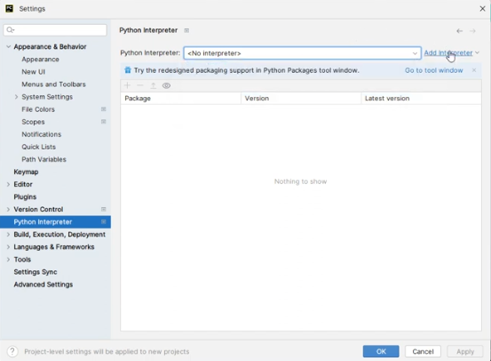 프로젝트 설정에서 Python 인터프리터를 선택하고 필요한 경우 가상 환경을 구성할 수 있습니다.