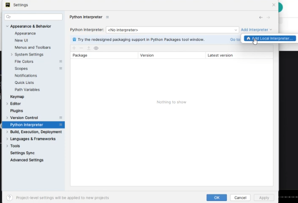 python interpreter - add Local ... -> System interprter에서 내가 설치한 python경로에 python.exe를 선택.