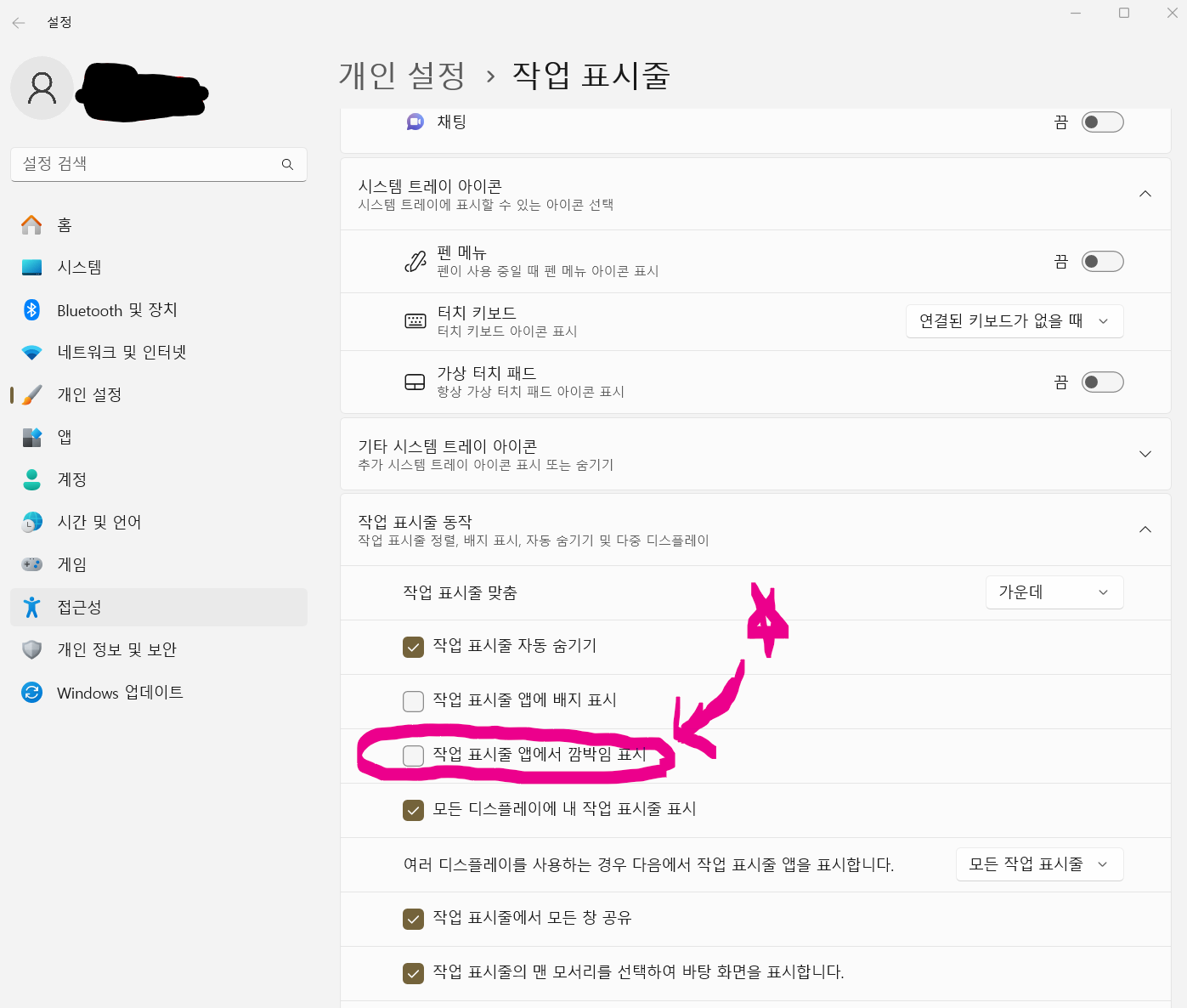 작업 표시줄을 자동으로 숨기는 설정이 활성화되어 있는지 확인: 설정 > 개인 설정 > 작업 표시줄로 이동하여 '작업 표시줄 자동 숨기기' 옵션이 활성화되어 있는지 확인합니다. 데스크탑과 태블릿 모드 모두에서 이 설정을 확인하세요.